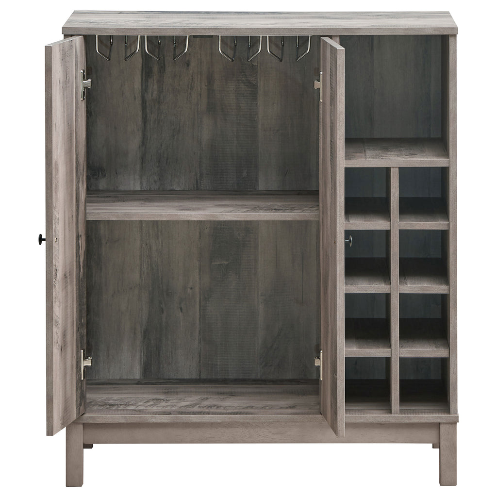 Perfect for compact homes comes this rustic wine cabinet. With a weathered Acacia wood-like finish over the frame, this wine cabinet lends itself to modern farmhouse style living rooms and dining rooms. On the right side are eight wine bottle storage cubbies, along with an open space for storing extra wine accessories. On the left side is a double-door cabinet that hides away all your items neatly inside, with the help of four stemware racks and two open shelves. Each cabinet door also features a matte black round pull that lends a modern flair. Key Features: • Wine cabinet with dual storage configuration and dedicated wine bottle cubbies • Weathered acacia finish adds rustic appeal with a modern farmhouse aesthetic • Two-door cabinet with interior shelving and four integrated stemware racks • Eight bottle compartments and upper cubby offer convenient open display options • Crafted from rubberwood, engineered wood, and laminate veneer surfaces • Matte black hardware and anti-tip kit included for enhanced safety and style