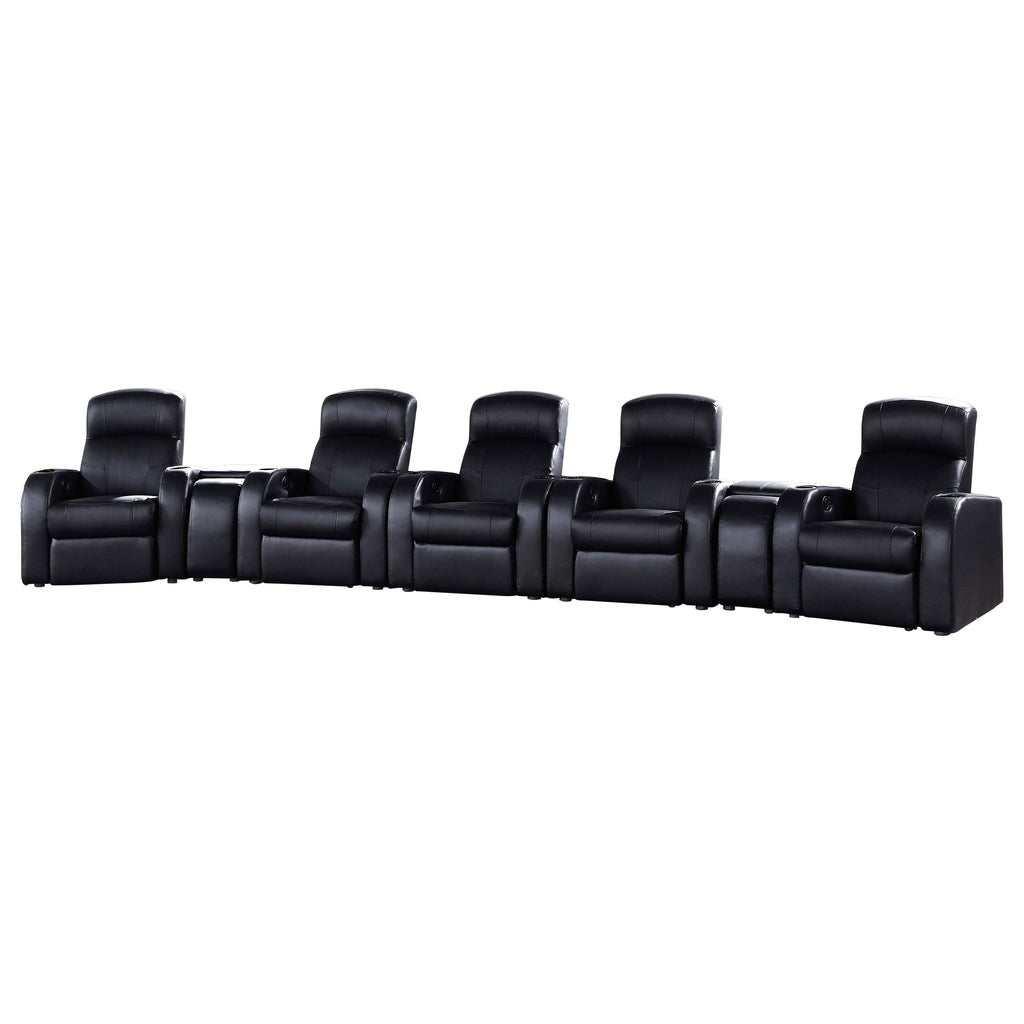 Experience cinematic luxury at home with this sleek home theater seating collection. Each recliner is upholstered in smooth black top grain leather everywhere the body touches, offering both elegance and durability. Designed with high backs, supportive pocket coil seating, and wall-hugger mechanisms, the recliners maximize comfort and save space. Built-in cupholders provide convenience, while optional wedge consoles add soft-closing storage for remotes and accessories. Modern stitching and rounded track arms complete the refined look, making this collection the ultimate in home entertainment seating._x005F_x000D_ Key Features: • Three top grain leather recliners create a sleek and modern home theater setup • Manual recline with wall-hugger design maximizes comfort and conserves space • High backrests and low rounded arms provide stylish ergonomic support • Two wedge consoles add storage versatility with soft-closing lift-top design • Each recliner includes dual cupholders for convenient beverage placement • Built with acacia, foam, leather, and plywood for lasting durability and style