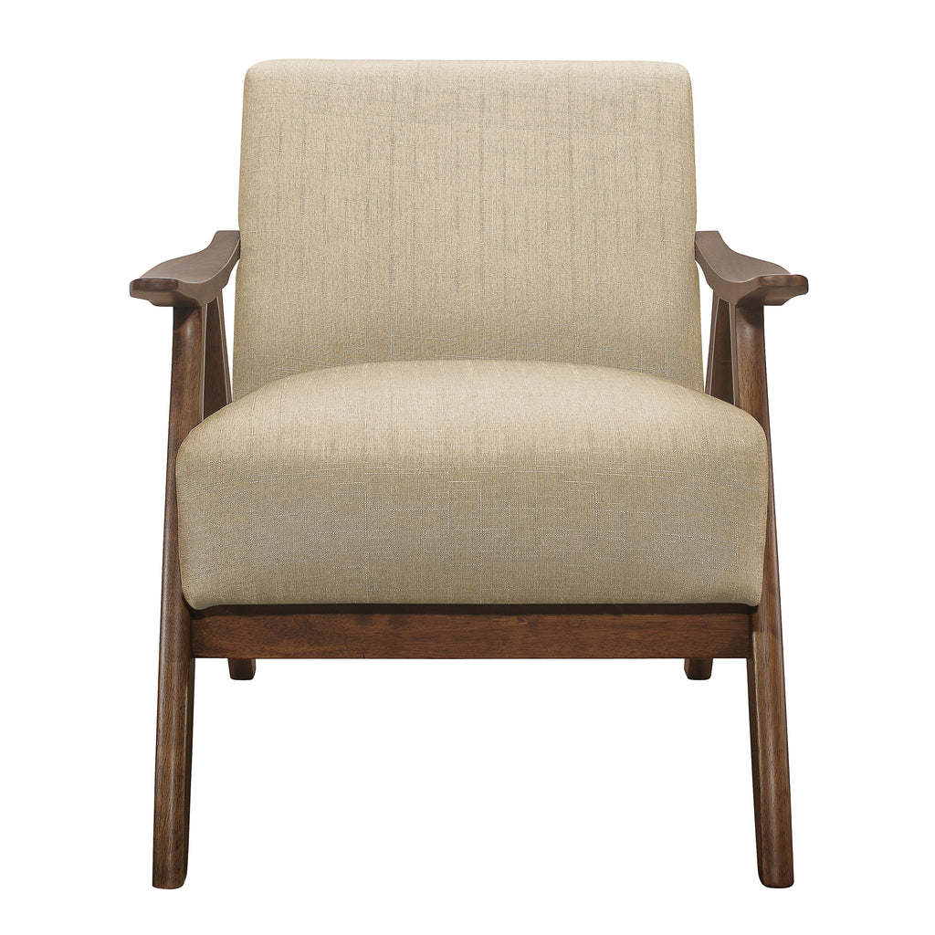 The retro-inspired wood framing of the Damala Collection will perfectly accent your modern home décor. Subtle contouring to the chair’s wood frame is finished in walnut, presenting as a classic complement to the brown fabric that covers the padded chair seat and back.