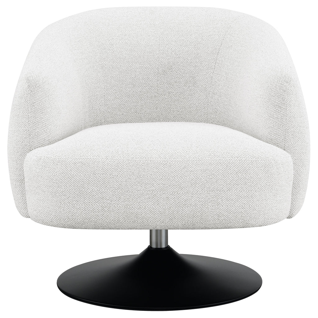 Elevate your seating area with this stylish swivel accent chair that blends modern sophistication with retro charm. Wrapped in soft beige boucle fabric, it offers a tactile texture and inviting comfort. The barrel-back silhouette features a tailored seat and gently curved arms for a clean, contemporary look. Supported by a matte black pedestal base, the chair rotates a full 360 degrees for effortless movement. Perfect for a living room or reading nook, it combines comfort, versatility, and modern flair. Key Features: • Swivel accent chair with stylish barrel-back silhouette and retro appeal • Soft beige boucle upholstery offers tactile texture and inviting comfort • Matte black pedestal base adds a sleek, modern contrast beneath seat • Full 360-degree swivel motion ensures smooth effortless mobility • Tailored tight back and seat provide clean lines and structured support • Durable metal, plywood, and larch frame ensures lasting stability