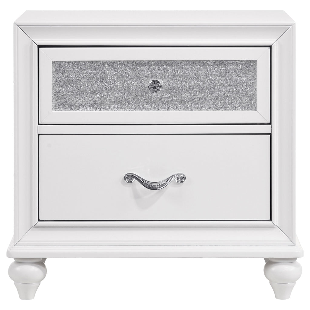 Add a touch of glamorous charm to your bedroom with this two-drawer nightstand. A clean white finish pairs beautifully with glittery acrylic drawer panels, creating a dazzling centerpiece beside the bed. Faceted crystal hardware enhances the sparkling effect, while sculpted bun feet add classic elegance. Built with solid rubberwood, engineered wood, and okume veneer, this nightstand blends durability with modern style. Two spacious drawers provide functional bedside storage with a chic flair._x000D_ Key Features: • Nightstand with white finish and glamorous details for chic bedroom appeal • Glittery acrylic drawer panels add sparkling texture and bold visual contrast • Faceted crystal hardware gleams against the smooth white frame construction • Two drawers offer ample storage to keep essentials organized bedside • Frame built with solid rubberwood, engineered wood, and okume veneer accents • Sculpted bun feet complete the design with timeless and elegant character