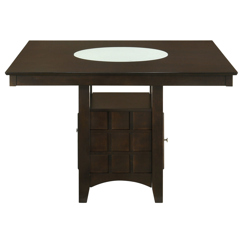 Appreciate the texture and dimension created with gris lattice details in a charming five-piece transitional counter height dining set. A rich cappuccino finish pairs with soft tan upholstery to create a neutral palette, perfect for creating a warm and welcoming ambiance in your kitchen or dining room. The set centers on a square dining table that includes a lower shelf and cabinet, offering multifunctional appeal that maximizes space utilization. The cabinet includes stemware and bottle storage to keep favorite vintages at your fingertips while enjoying delicious meals with friends and family. Chairs includes full backs and footrests for excellent support and comfort, while the open cube design lightens the overall look while ensuring rich dimensionality. Key Features: • Charming five-piece transitional counter height dining set with gris lattice details • Rich cappuccino finish pairs with soft tan upholstery to create a neutral palette • Square dining table includes a lower shelf and cabinet for multifunctional appeal and space utilization • Cabinet includes stemware and bottle storage for favorite vintages • Chairs feature full backs and footrests for excellent support and comfort
