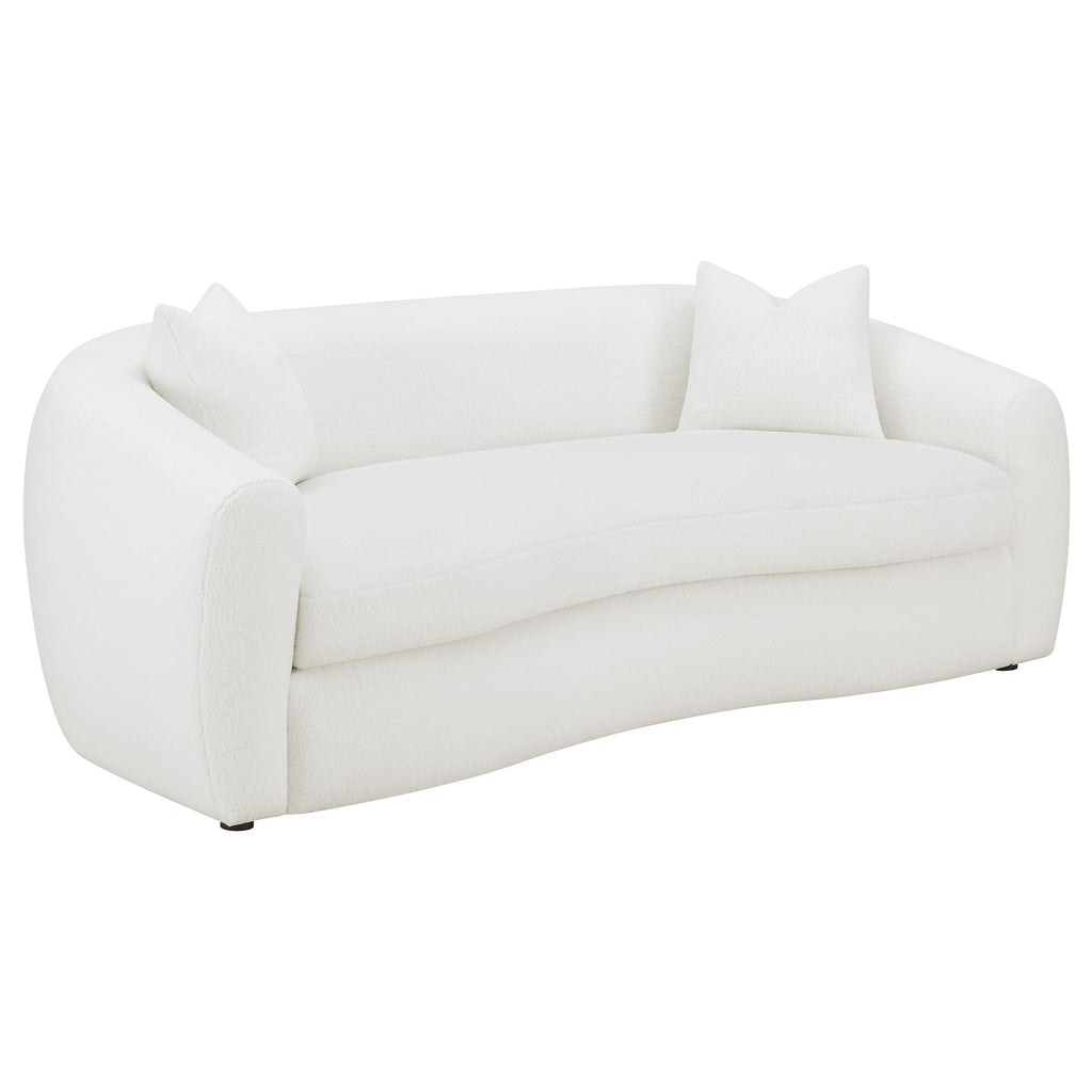 Bring modern warmth and soft texture to your home with this elegantly curved sofa. Upholstered in a plush faux sheepskin boucle fabric, it features smooth contours and sloped armrests that create a sculptural, contemporary silhouette. The tight back and plush bench seat provide comfort and support, while matching accent pillows filled with faux down add cozy refinement. Perfect for living spaces that blend modern design with inviting comfort, this sofa offers timeless style and everyday luxury._x005F_x000D_ Key Features: • Curved sofa upholstered in natural faux sheepskin boucle fabric • Smooth rounded edges highlight refined modern craftsmanship • Tight back and plush seat cushion provide lasting comfort • Includes matching accent pillows with soft faux down fill • Crafted from durable wood, foam, and high-quality fabric blend • Perfect for modern or transitional living room arrangements