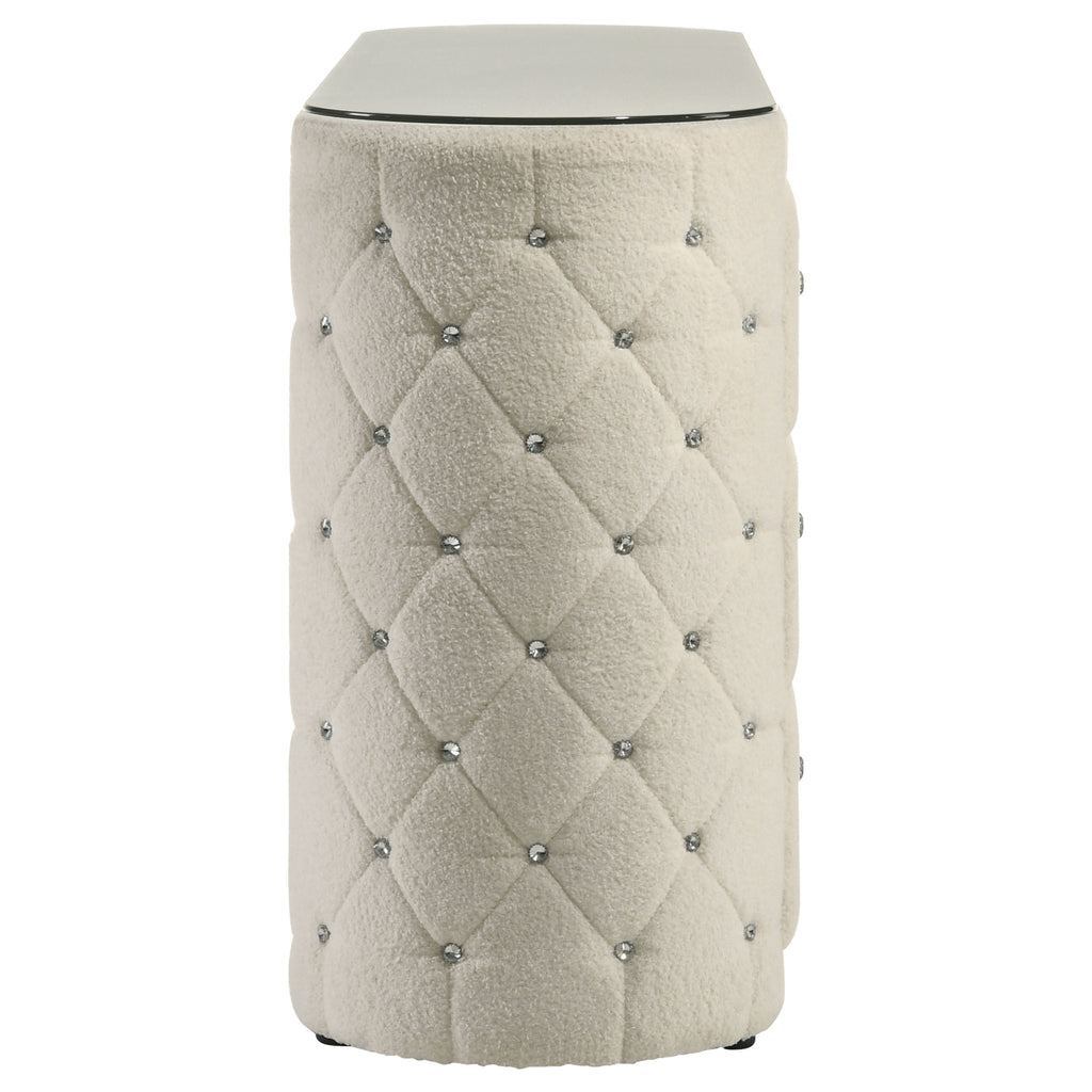 Soft texture meets luminous detail in this statement-making dresser. Wrapped in ivory boucle, the piece features vertical channeling across six spacious drawers, each adorned with crystal-inspired hardware for a hint of sparkle. Diamond tufting along the sides adds depth and dimension, while a clear tempered glass top provides a smooth surface without concealing the luxe upholstery. With its elegant form and functional storage, this dresser elevates everyday routines. Key Features: • Dresser features plush boucle upholstery in soft ivory with vertical channel-detailed drawers • Six drawers provide generous storage for bedroom essentials with easy-access organization • Crystal-style drawer pulls add a glamorous touch and a hint of sparkle • Diamond-tufted side panels bring visual depth and a couture-inspired accent • Clear tempered glass top protects the fabric while offering a durable, polished surface • Crafted from solid rubberwood, engineered wood, boucle fabric, and foam for longevity