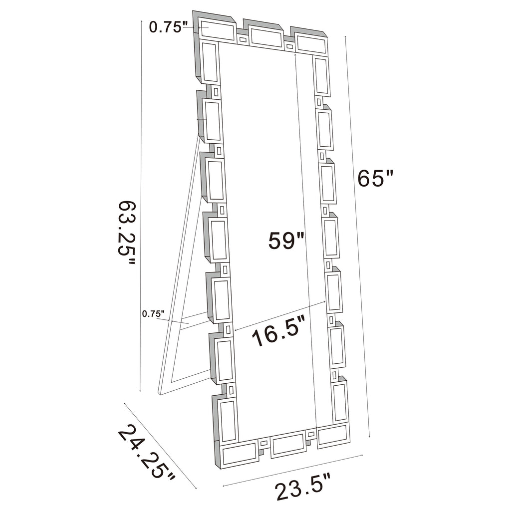 Check your fashionable ensemble with this charming, modern glam cheval mirror. A sophisticated frame of open rectangles and squares surrounds the main mirror, lending a Greek key-inspired silhouette for a classical aesthetic. Each sleek, boxy shape is covered in a mirror trim tile designed with a subtle bevel edge for a hint of texture and extra dimension. A rear kickstand leans the cheval mirror backward ever so slightly, allowing you to see your whole look before stepping out for dates and workdays. Place this elegant cheval mirror in your bedroom to create an instant dressing area. Key Features: • Standing floor mirror with full-length design and bold geometric frame • Segmented mirrored overlay adds layered dimension and structure • Abstract pattern detail creates visual movement across the border • Ideal for dressing areas, bedrooms, or modern foyers • Freestanding silhouette supports easy repositioning within space • Made from engineered wood and mirror materials for strength and shine