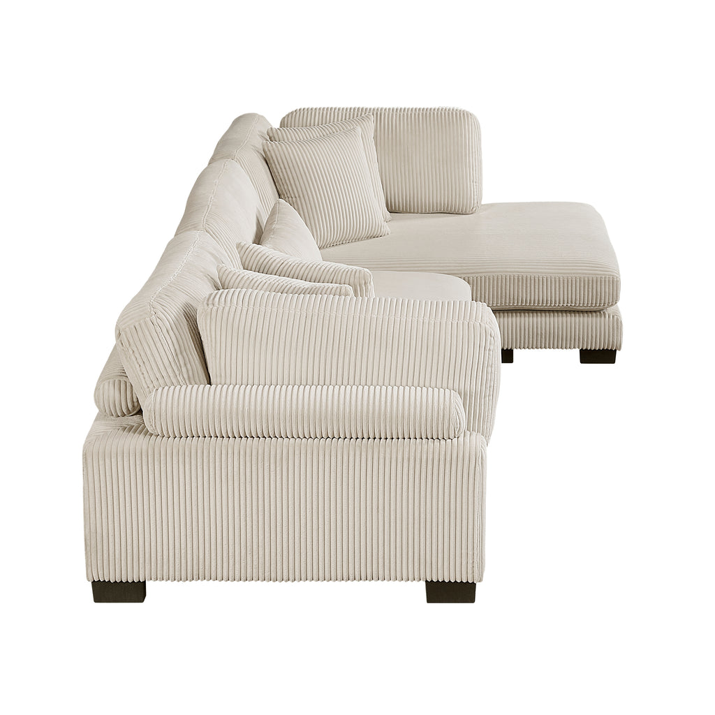 Configurable to your available space, the Traverse Collection allows for the addition and detachment of pieces for a customized seating experience. The 3-piece sectional configuration consists of one corner unit paired with one armless chair, and a chaise. The beige corduroy fabric upholstery creates a plush expanse for a soft touch experience.