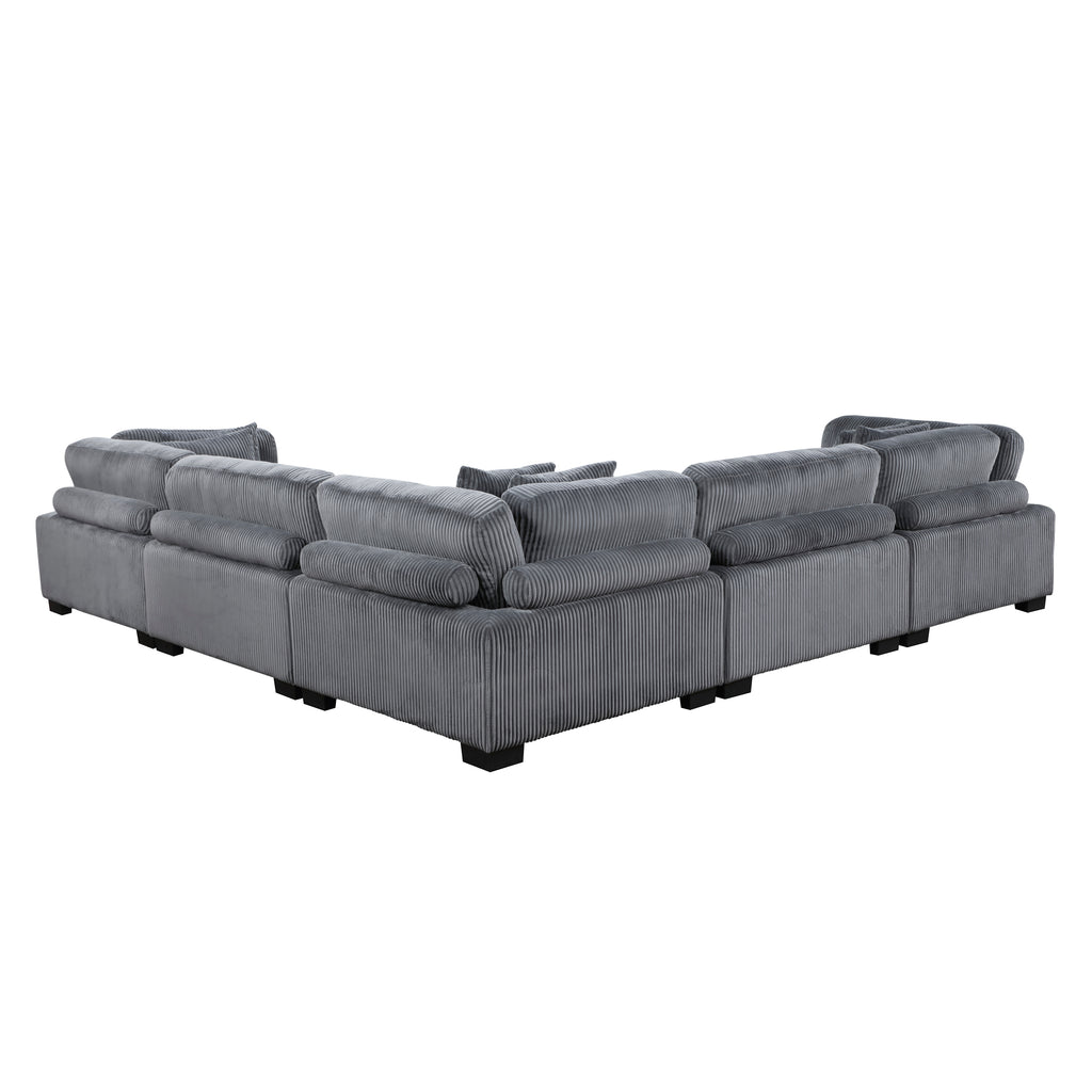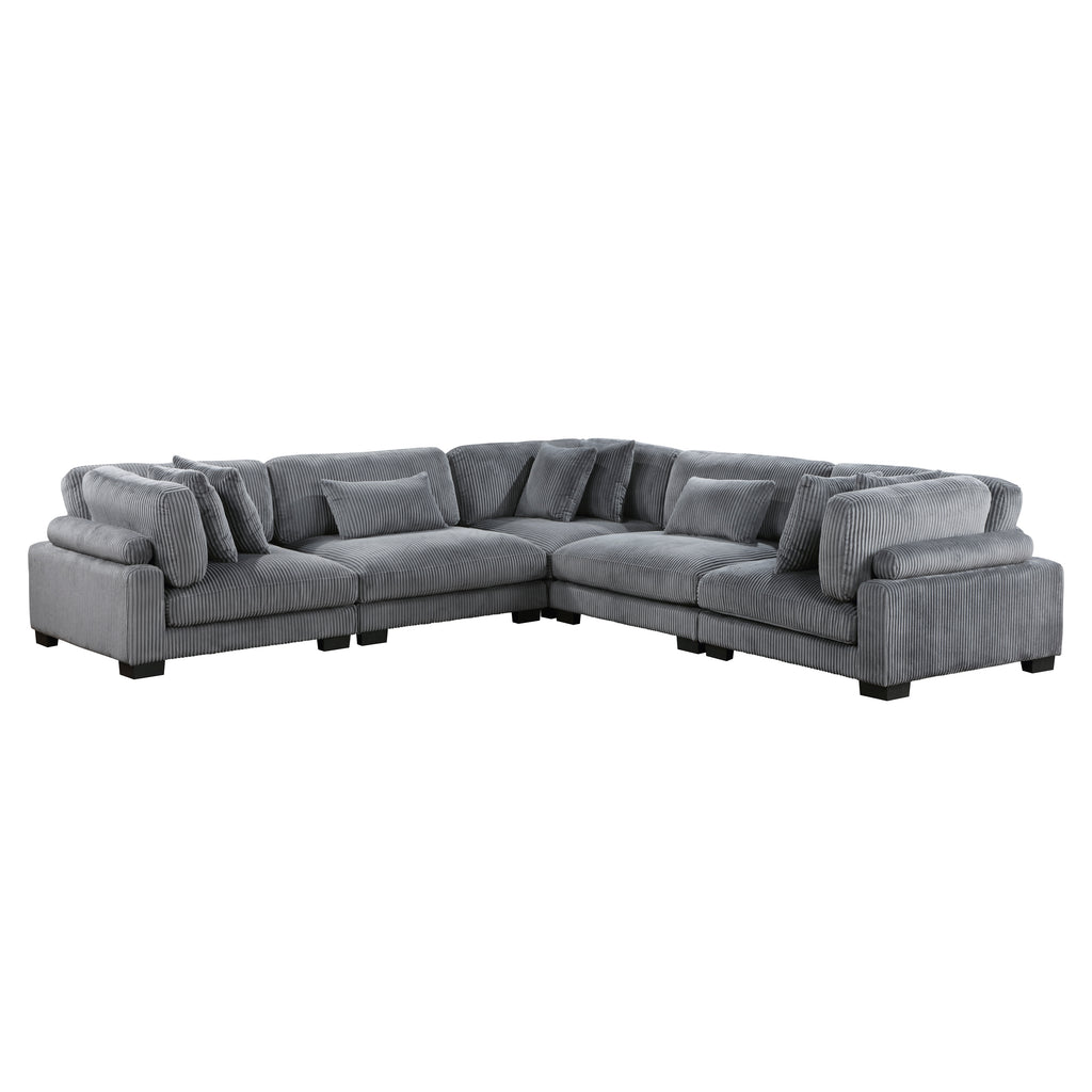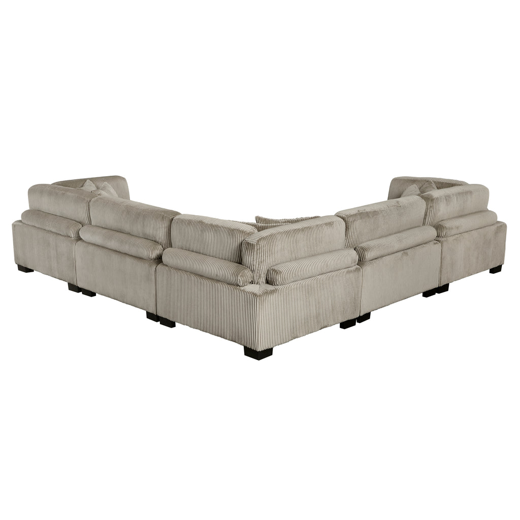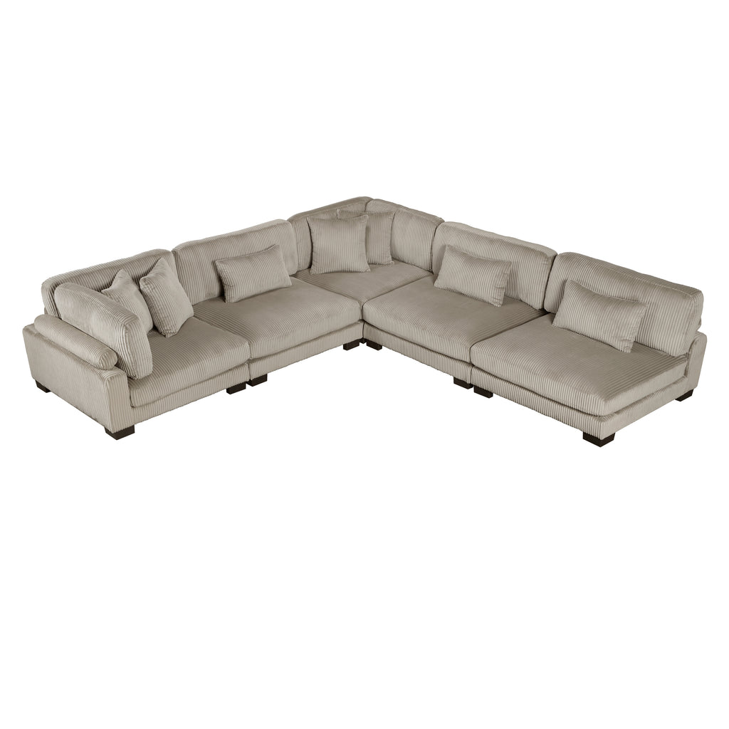 Configurable to your available space, the Traverse Collection allows for the addition and detachment of pieces for a customized seating experience. The 5-piece sectional configuration consists of three corner units paired with two armless chairs. The beige corduroy fabric upholstery creates a plush expanse for a soft touch experience.