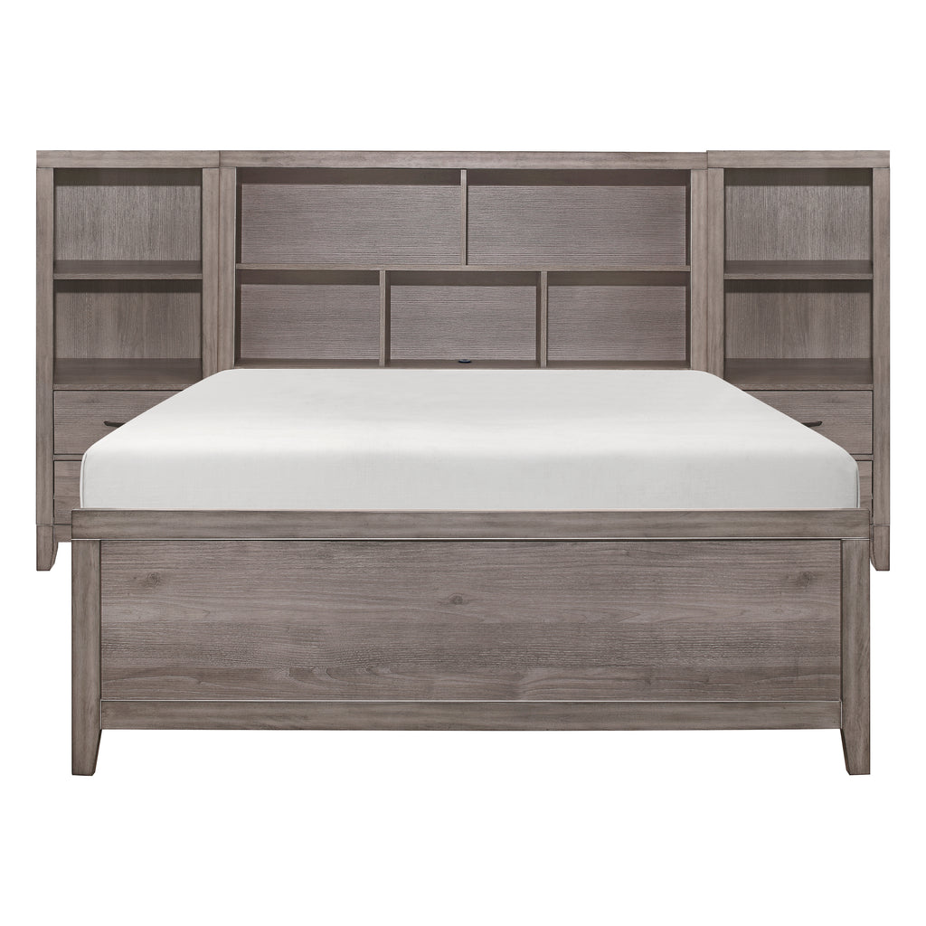 Industrial design is subtly used to achieve a cool look for your bedroom in the Woodrow Collection. Dark metal hardware and corner banding with rivet look lend to the casual look of this bedroom group. Melamine laminate features a weathered-wood look that furthers the intended design. The bookcase headboard provides ample space for your bedside storage needs. Further functionality comes in the form of an optional tower night stand and under-bed toy boxes.