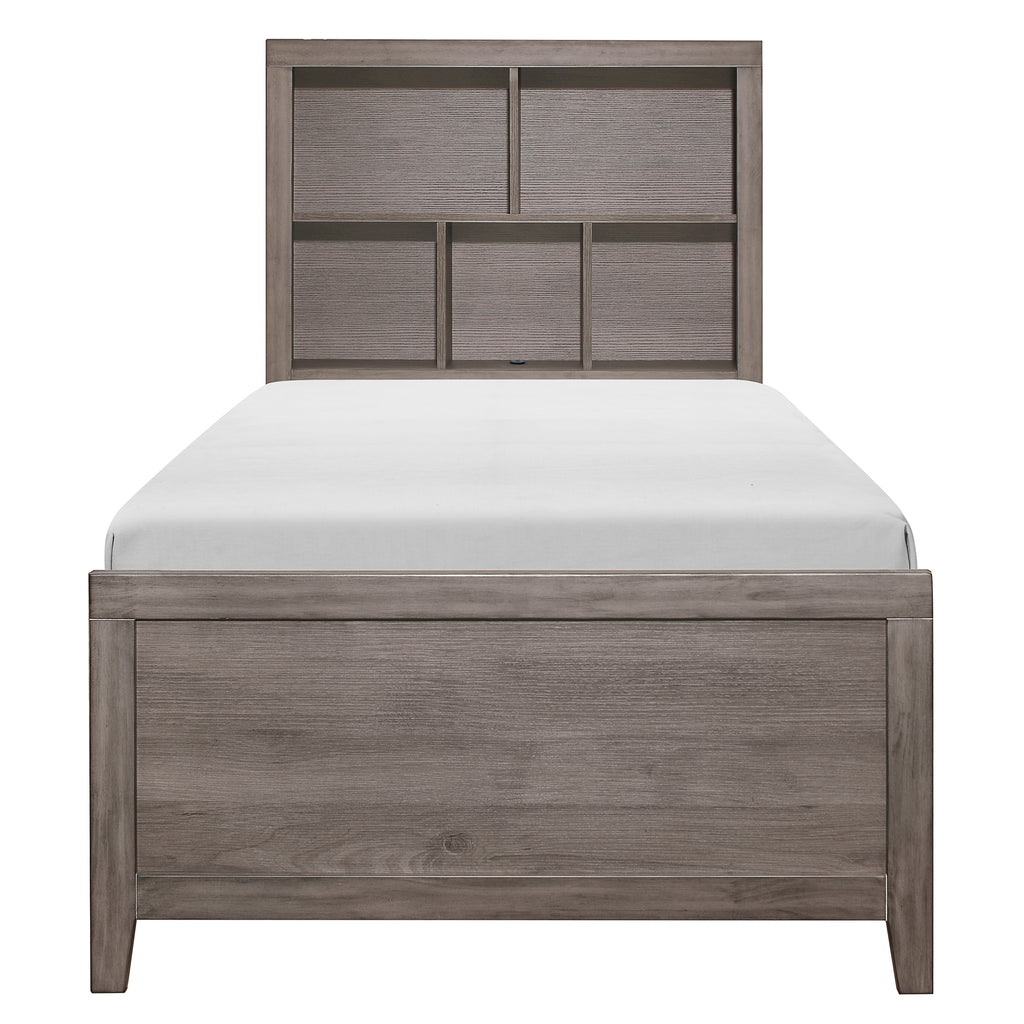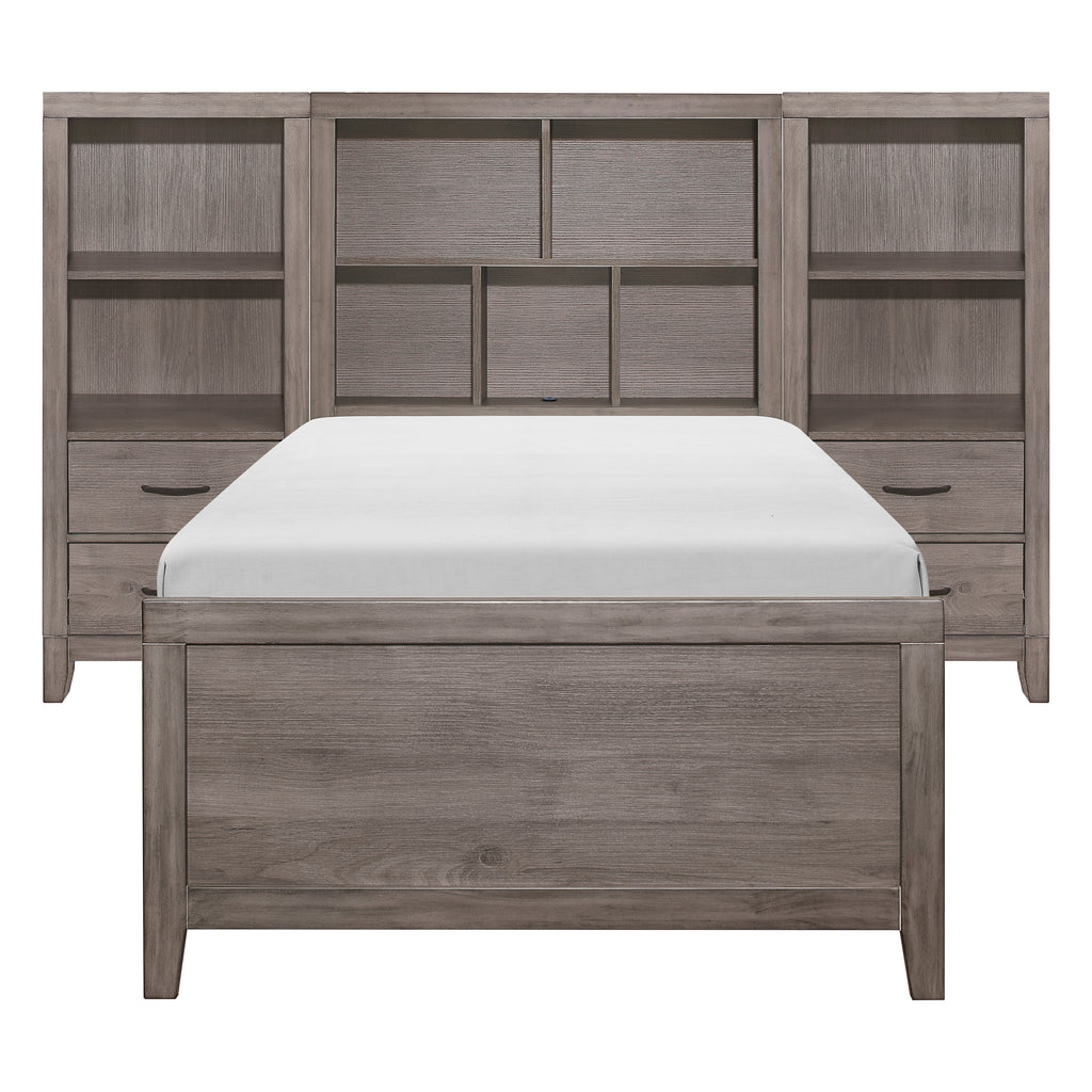 Industrial design is subtly used to achieve a cool look for your bedroom in the Woodrow Collection. Dark metal hardware and corner banding with rivet look lend to the casual look of this bedroom group. Melamine laminate features a weathered-wood look that furthers the intended design. The bookcase headboard provides ample space for your bedside storage needs. Further functionality comes in the form of an optional tower night stand and under-bed toy boxes.
